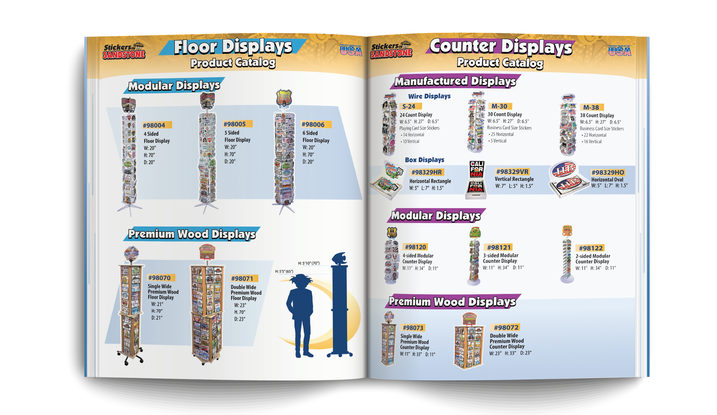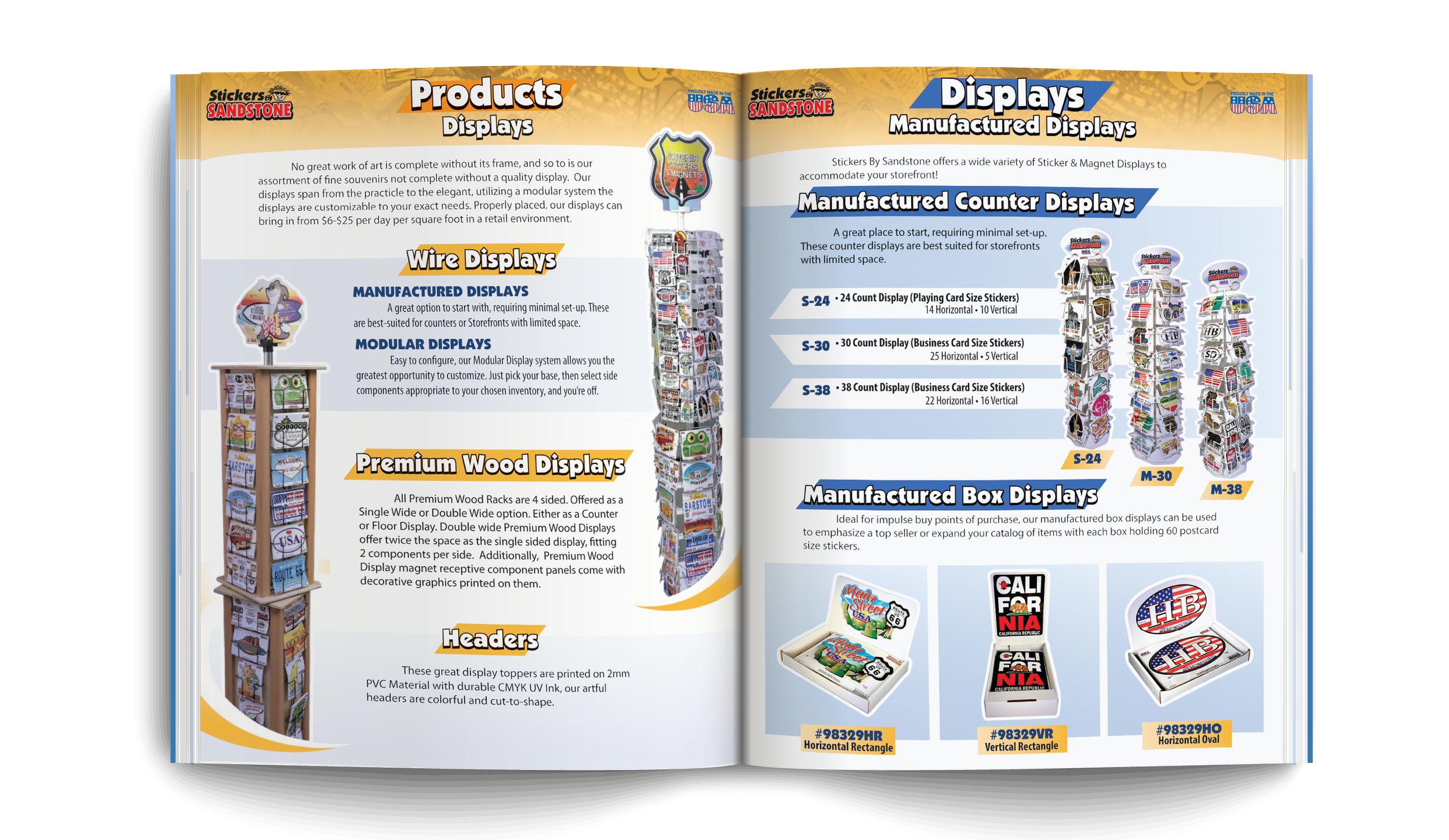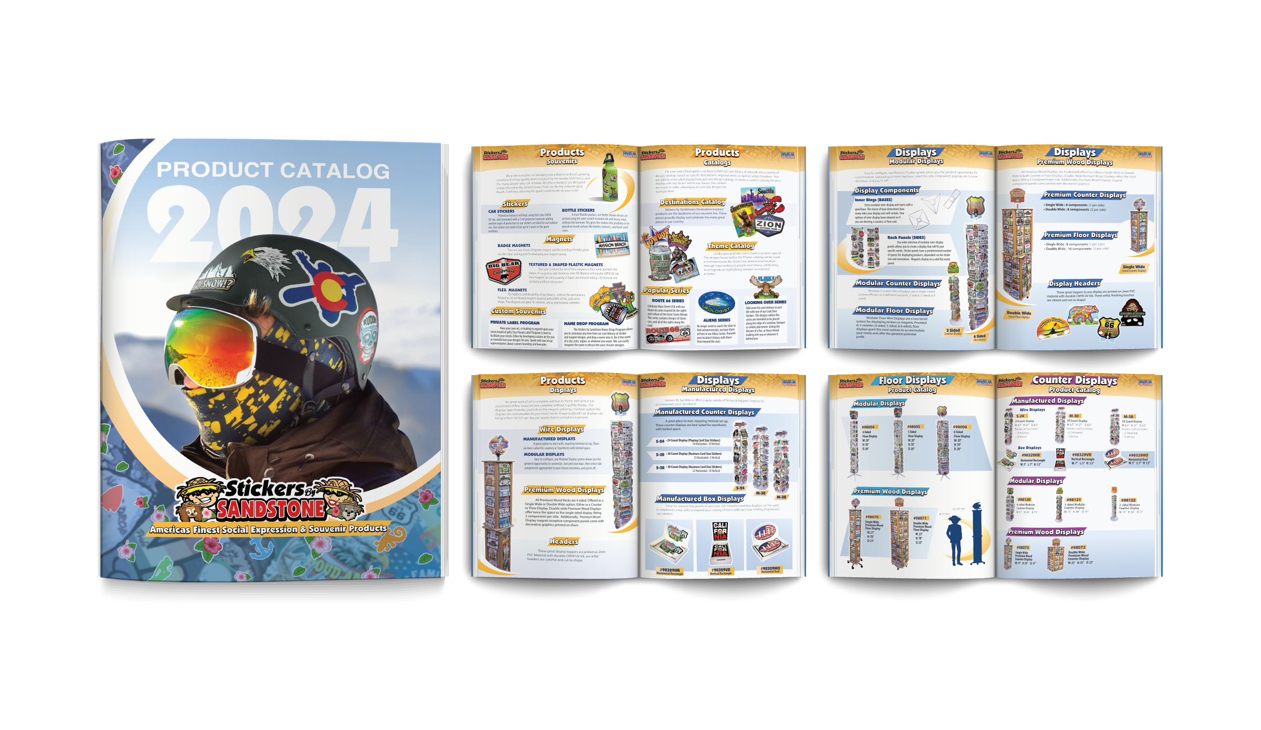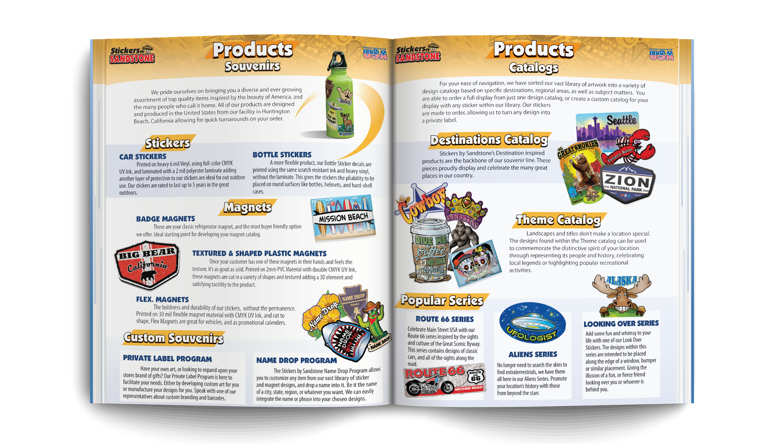 A product catalog for Stickers By Sandstone, designed with the capacity in mind for each page or section to serve as an individual flyer or sale sheet when needed.